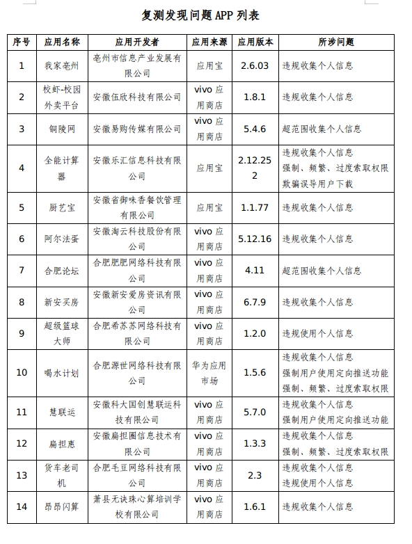 截至目前,尚有14款APP存在未整改问题(详见附表),相关APP企业应在3月1日前落实整改。逾期不整改的,安徽省通信管理局将依法依规组织开展相关处置工作。