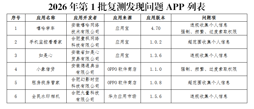 安徽省通信管理局关于侵害用户权益APP的通报(2026年第1批)