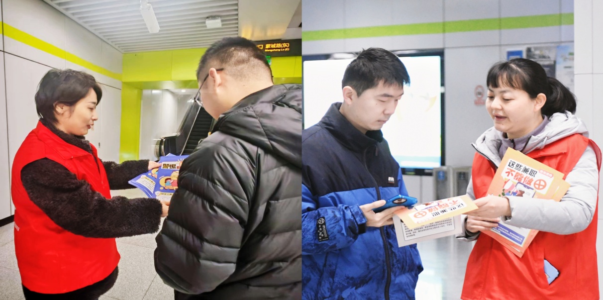 活动现场,身穿“红马甲”的志愿者们热情地向过往乘客发放宣传单,内容涵盖常见诈骗类型、典型案例分析以及应对方法。同时,在地铁站的出入口等醒目位置张贴了反诈主题横幅和海报,生动形象地揭露了“积分兑换陷阱”、“虚假百万保险”、“AI伪装”等骗局的作案手法,由此提醒广大市民不明链接莫点击、不明软件莫下载、不明音影莫轻信。