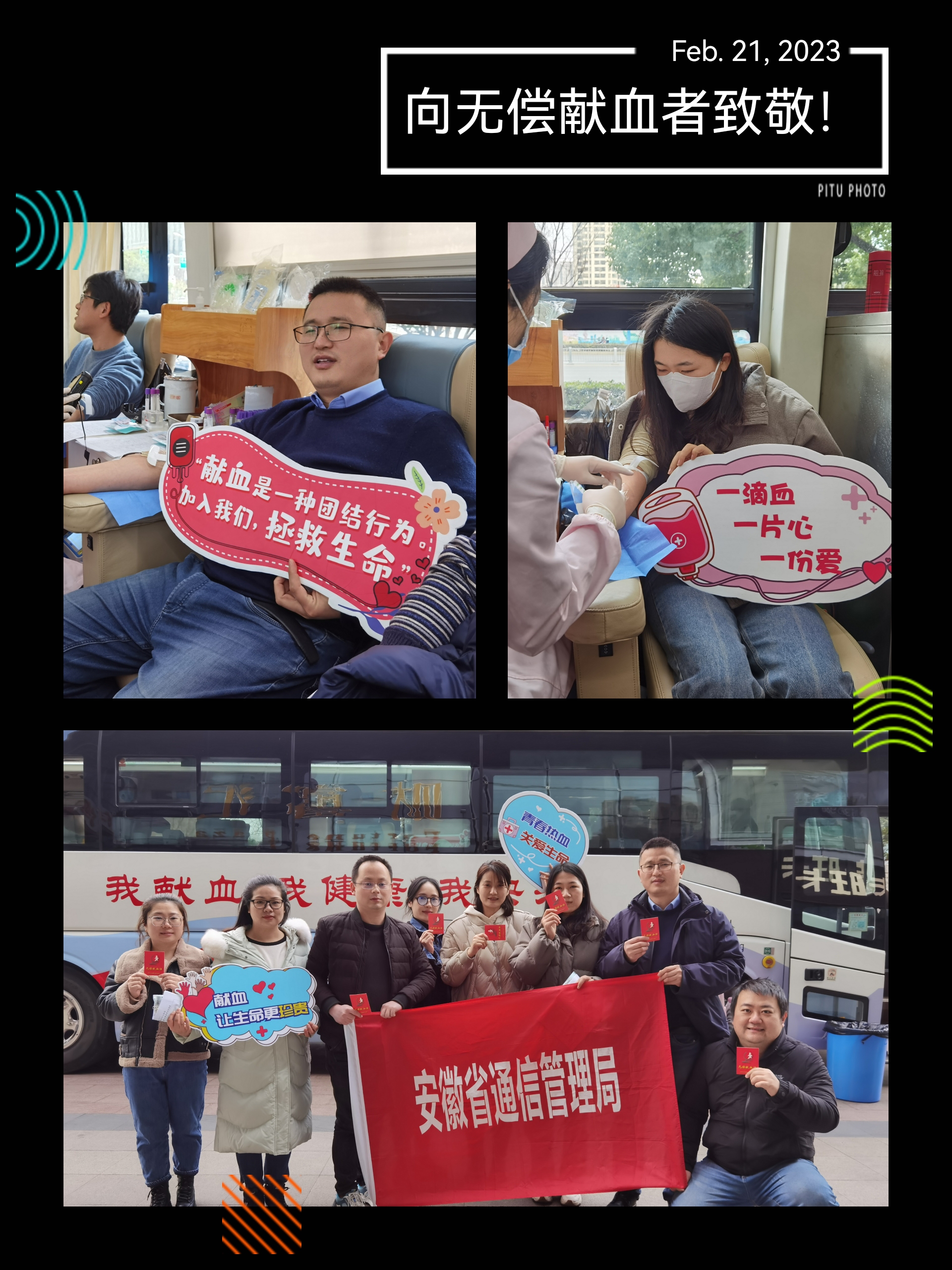 2023年2月21日,局机关党委组织党员职工开展“人人为我,我为人人,无偿献血,无尚光荣”集中献血活动,倡议局全体党员职工发扬人道主义精神,用心行动起来,伸出手臂、献出爱心,加入到无偿献血的志愿者行动队伍中来。上午9点,参加无偿献血的党员职工来到在濉溪路财富广场大厅,填表、体检、化验、等候、抽血、休息,所有流程都在市中心血站医护人员的指导下井然有序的进行,大家脸上洋溢着快乐的笑容,感受到了爱心奉献带来的温暖与幸福。